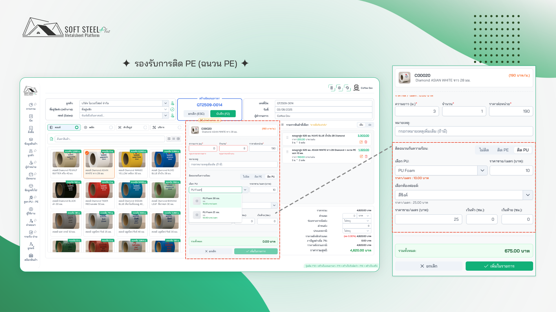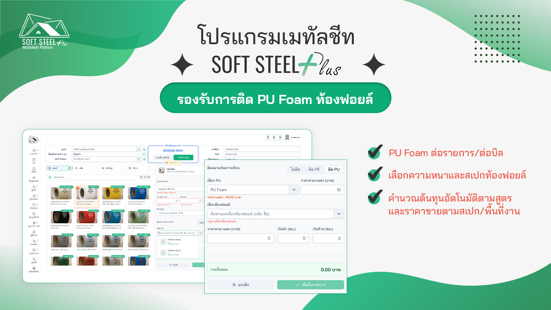 งานติด PU Foam พร้อมท้องฟอยล์ คิดต้นทุนตามสูตรและความหนา คิดราคาขายอัตโนมัติ ใช้งานได้ในใบเสนอราคา ใบสั่งผลิต และใบส่งของ